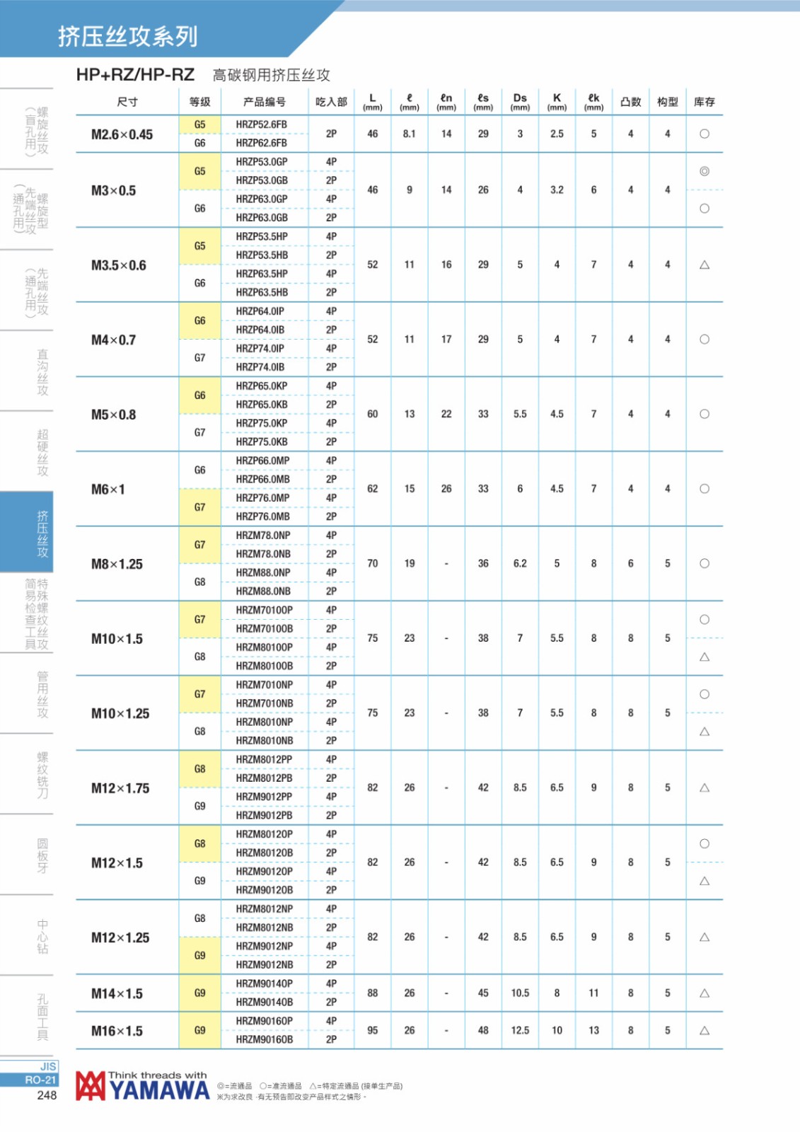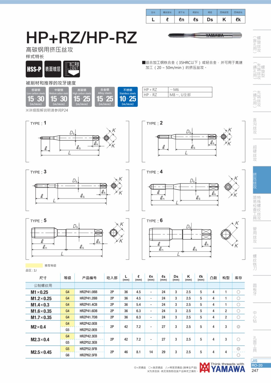 * 適合加工鋼鐵合金(HRC35以下)或輕合金、并可用于高速加工(20-50m/min)的擠壓絲攻。